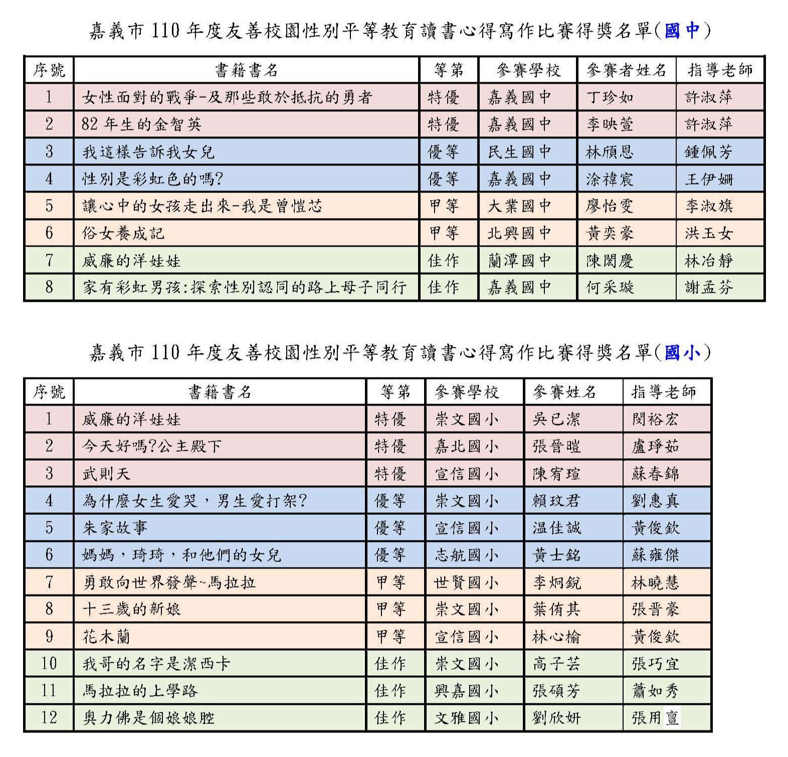 【110學年度嘉義市性別平等教育讀書心得寫作比賽】