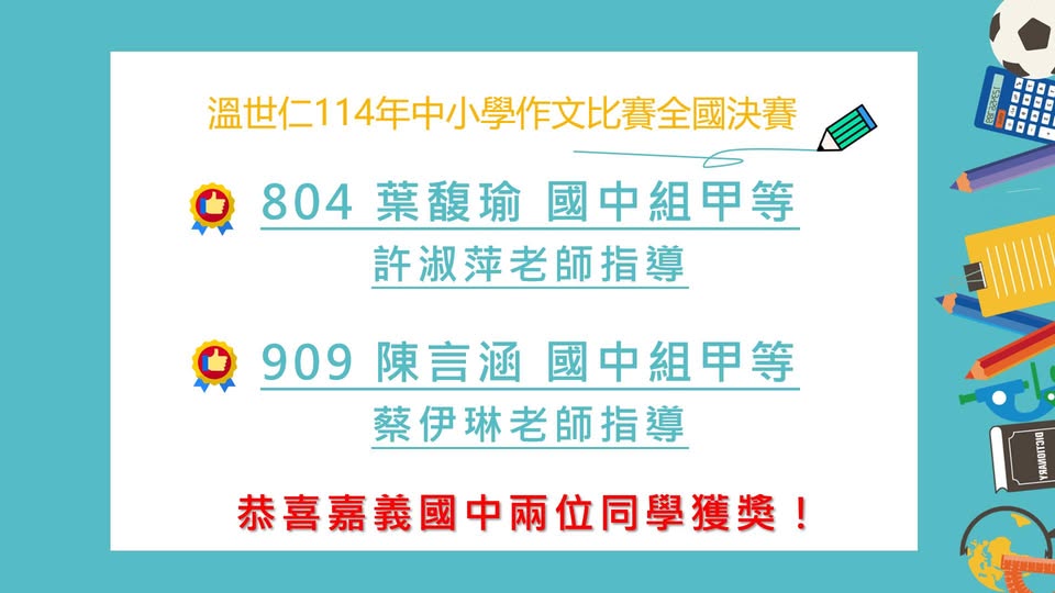 恭喜得獎同學,也感謝校內國文老師指導,本校將持續致力於閱讀與寫作教育推動,鼓勵學生多閱讀、多寫作,培養自信表達與思辨能力,讓孩子在文字中找到自己的聲音。