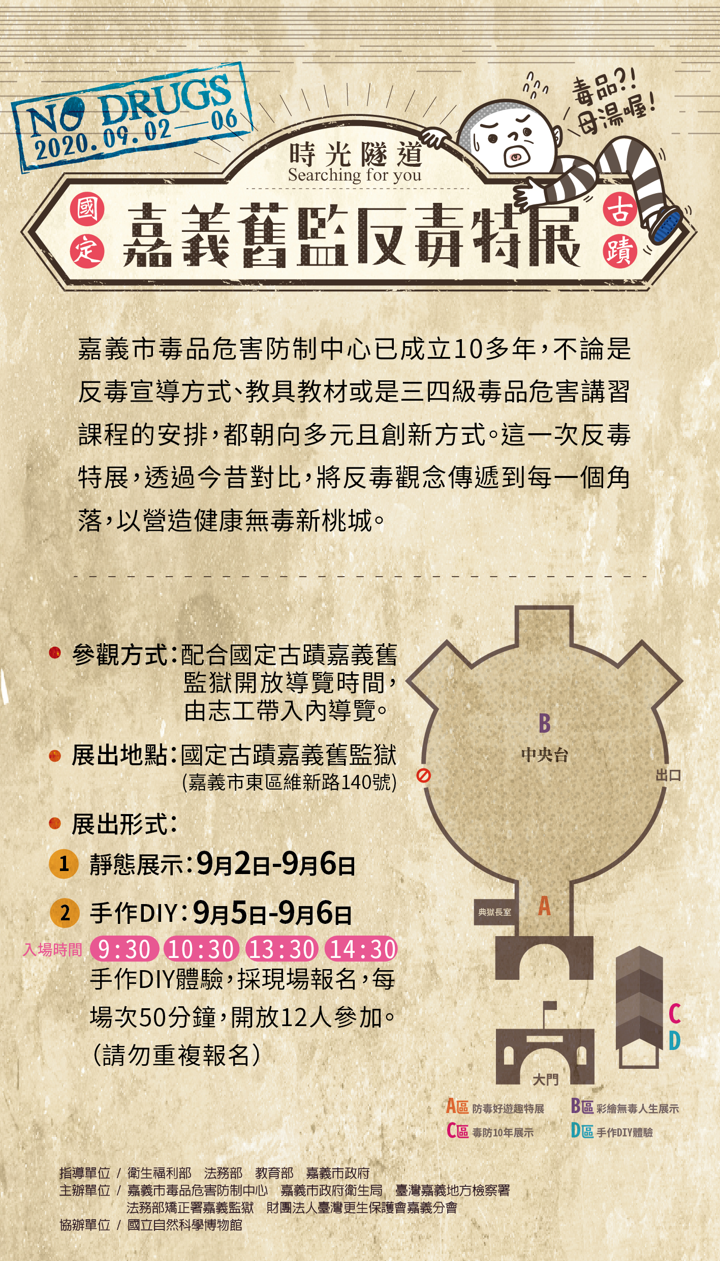 為增進毒品危害認知,嘉義市毒品危害防制中心辦理「時光隧道 Searching for you-國定古蹟嘉義舊監反毒特 展」,鼓勵師生踴躍參與。