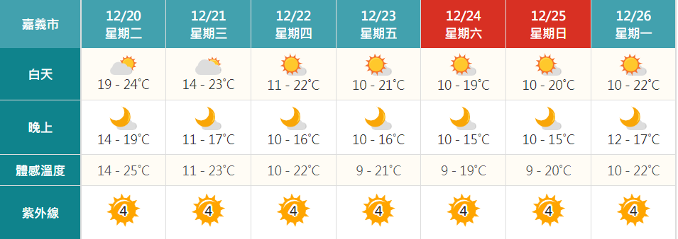 新北市、基隆市、臺北市、桃園市、新竹市、新竹縣、苗栗縣、臺中市、南投縣、宜蘭縣、金門縣有10度以下氣溫發生的機率,請注意。