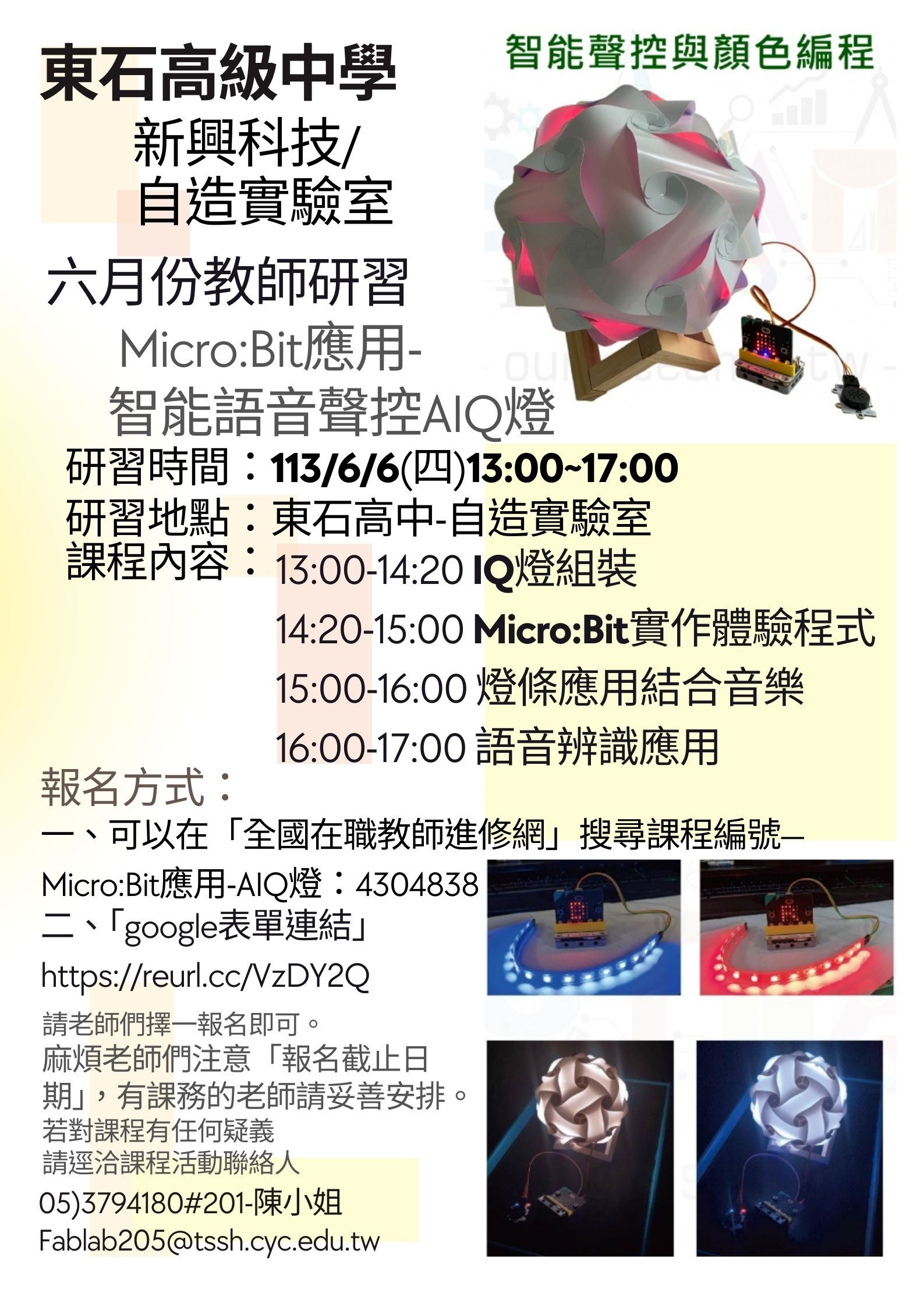二、研習主題及時間:Micro:Bit—智能語音聲控AIQ燈,課程代碼4304838,6月6日(星期四)下午1時至下午5時。