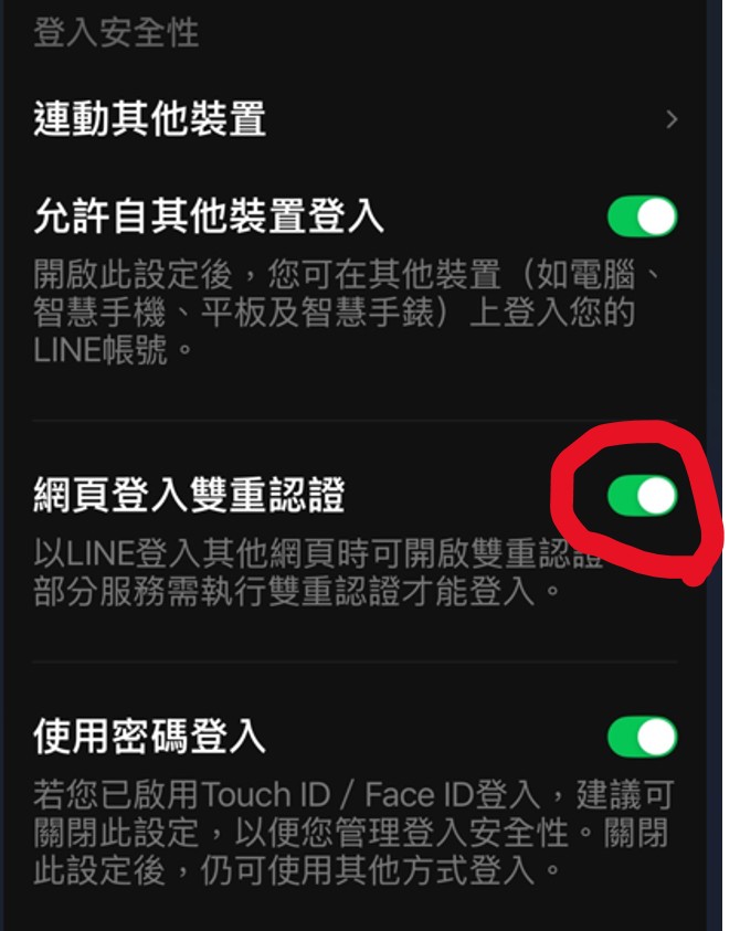 開啟後,未來在新裝置登入 LINE 時,除了輸入帳號密碼外,還會傳送驗證碼到你的手機簡訊,必須輸入才能登入。