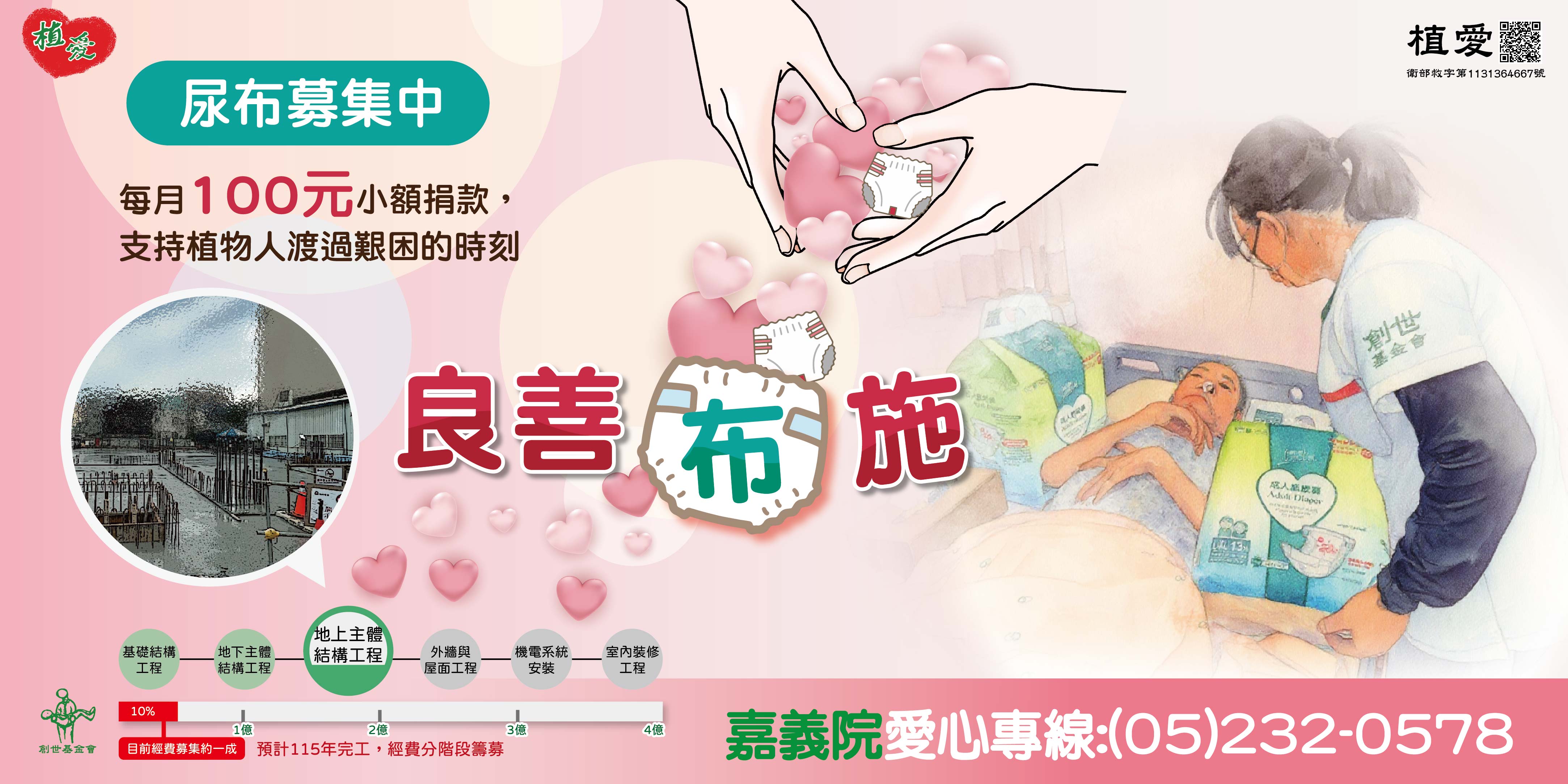 「良善布施」邀請您每月捐款100元,幫助植物人減輕尿布開銷。100元,也許只是您一天的咖啡錢,卻能為植物人帶來潔淨、舒適與尊嚴。