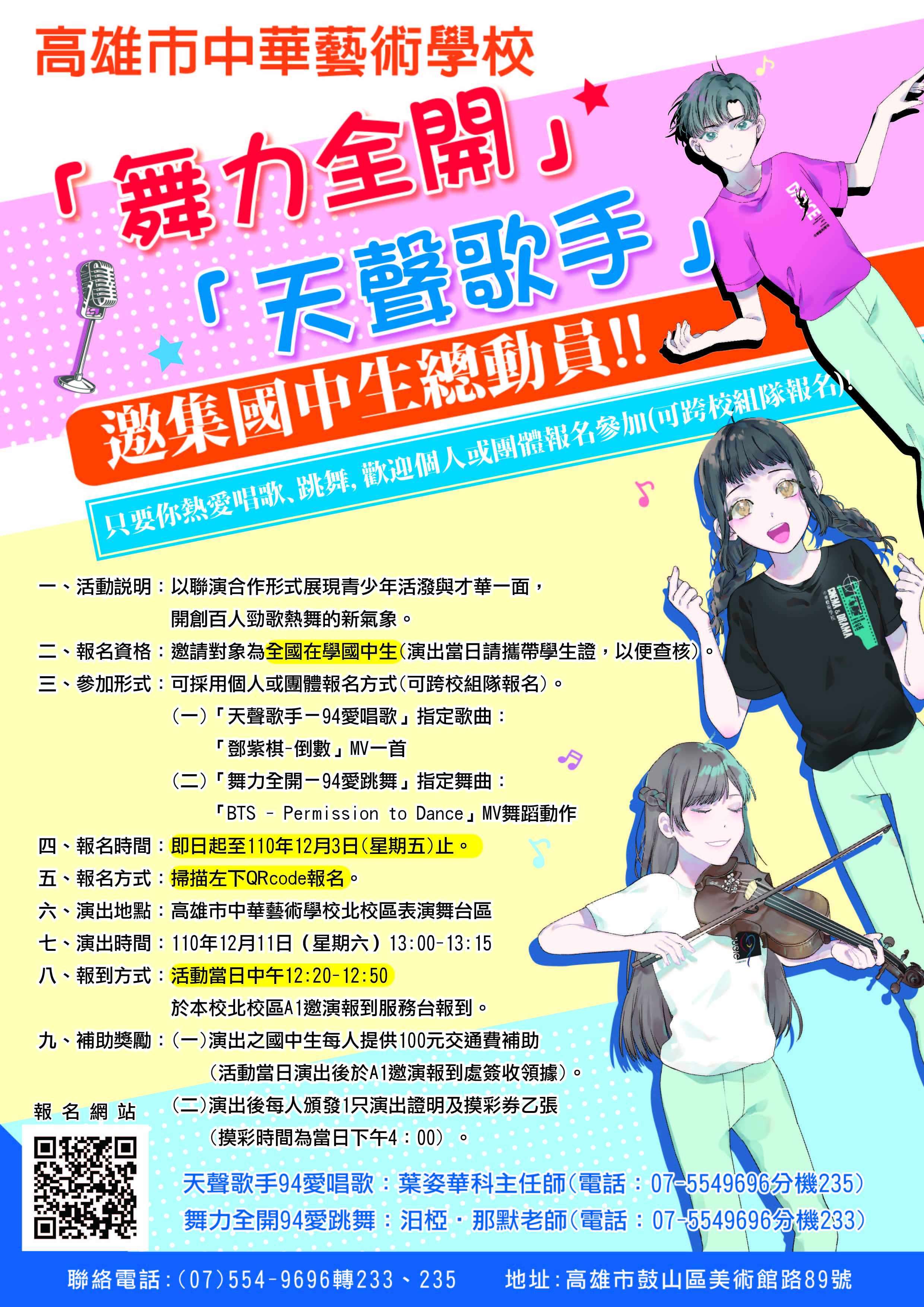 主旨:高雄市私立中華高級藝術職業學校2021秋季展演「舞力全開-94愛跳舞」、「天聲歌手-94愛唱歌」邀演活動,廣邀在校國中生參與。