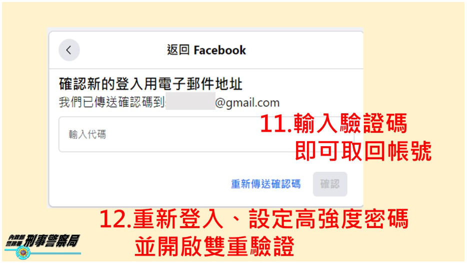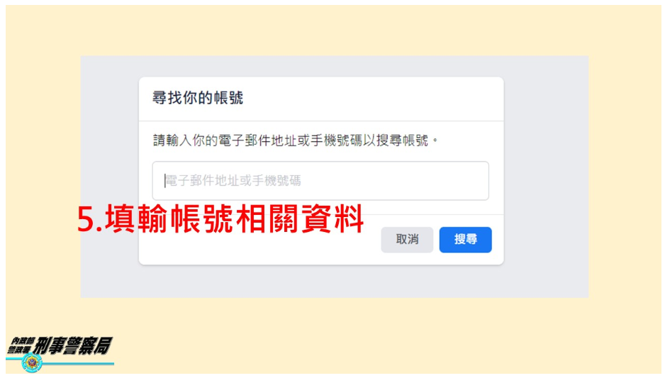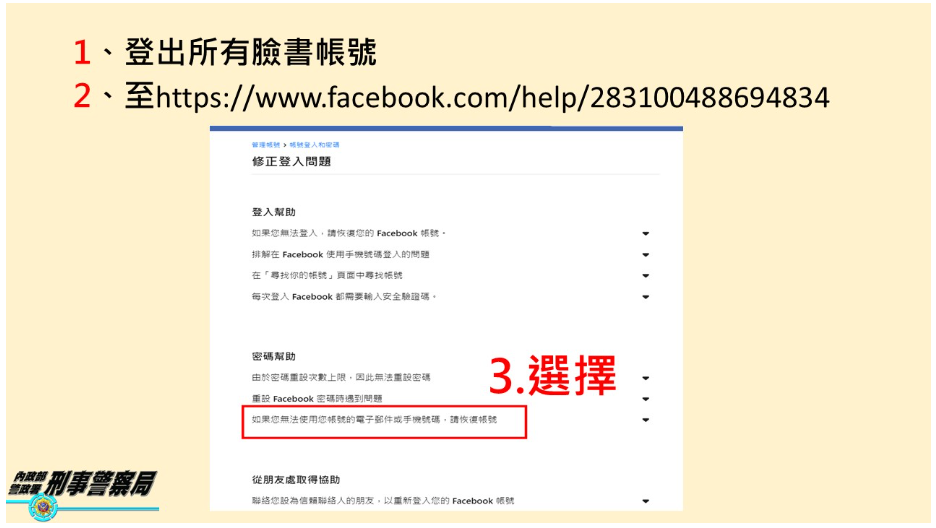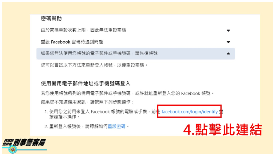 *遭盜用者自行透過Facebook網站取回帳號管理權(https://www.facebook.com/login/identify)