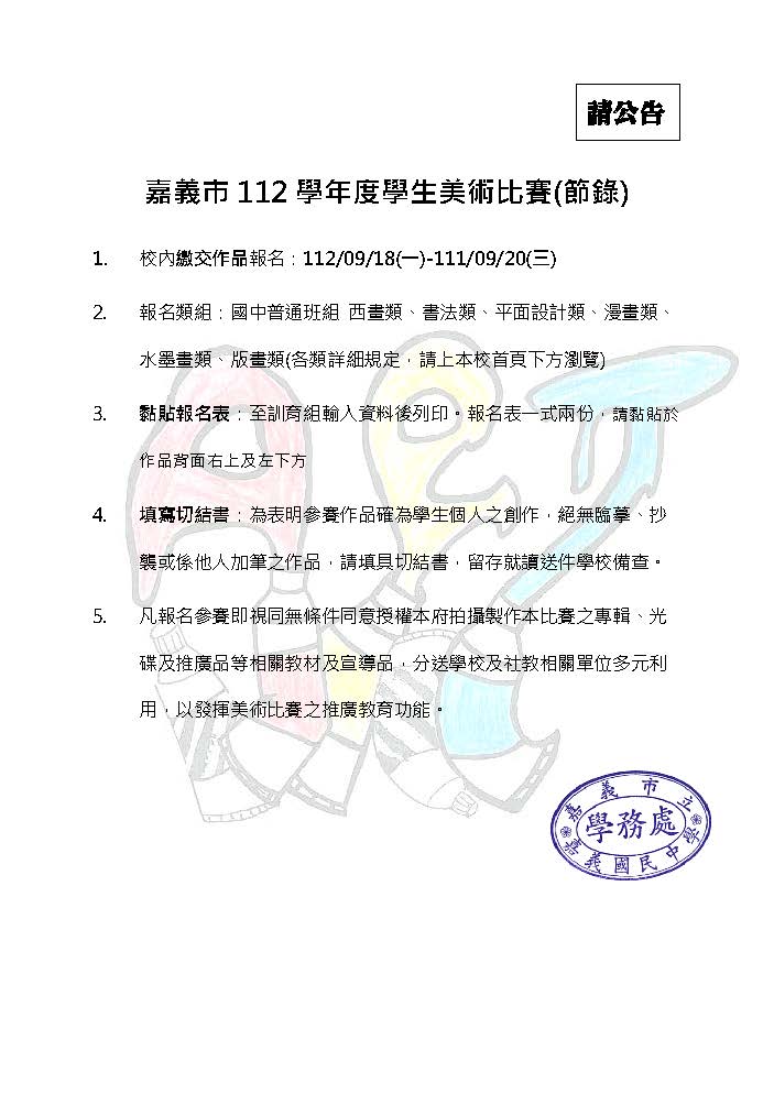 (二)第十一點參賽方式及對象第三項書法類比賽方式第一款採送件方式辦理,惟各組初賽獲選前3名者,應參加112年10月18日(星期三)下午2時假蘭潭國中活動中心辦理之現場書寫。