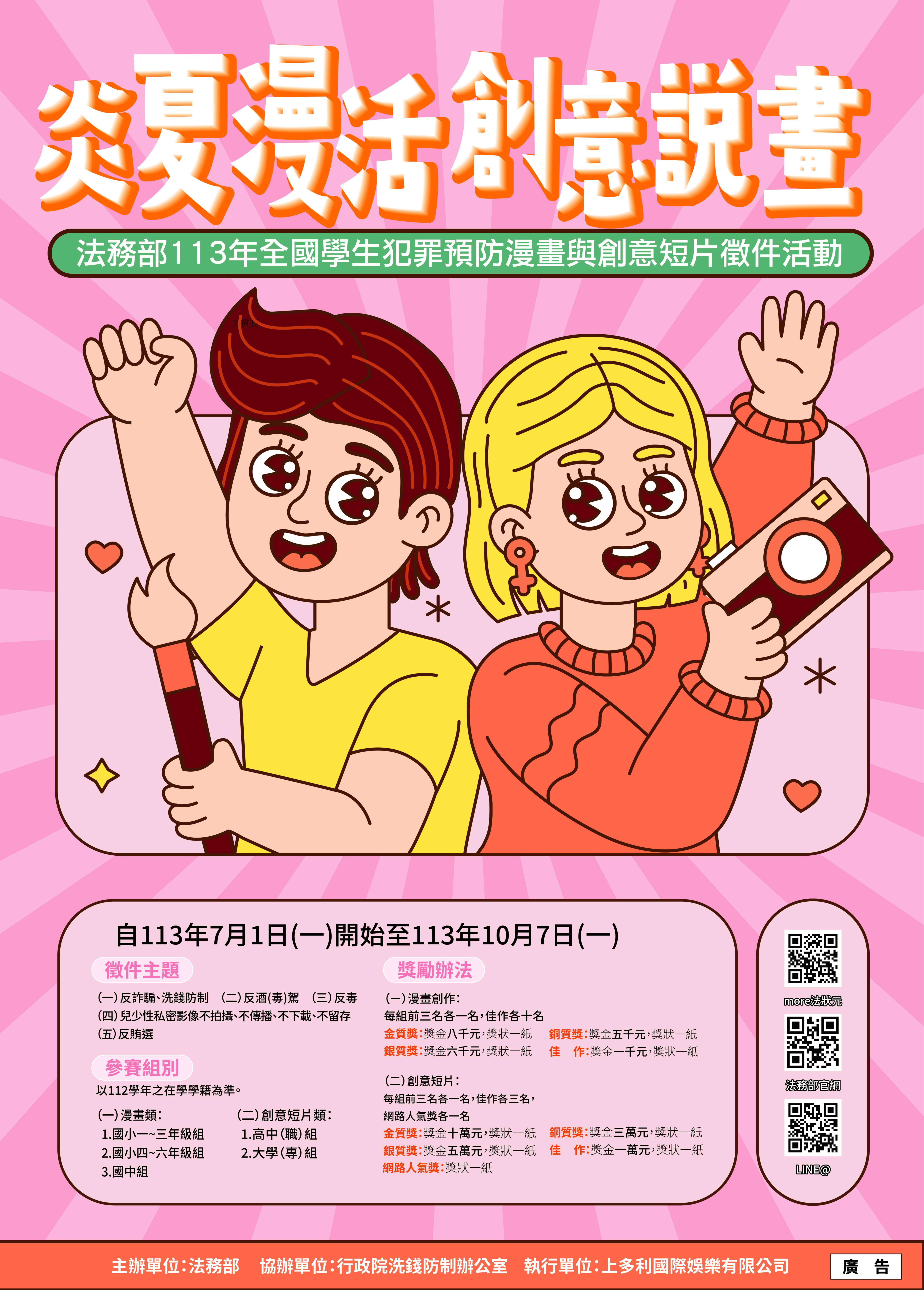 轉知法務部辦理「炎夏『漫』活,創意說『畫』」113年 全國學生犯罪預防漫畫與創意短片徵件活動辦法、報名 表、海報等各乙份,請查照。