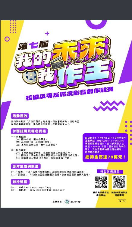檢送教育部第七屆「我的未來我作主」校園反毒反霸凌影 音創作競賽辦法及宣傳海報各1份(如附件),請鼓勵學 生踴躍報名,請查照。